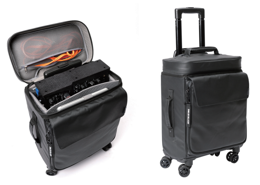 먼저 솔리드 블레이즈 캐빈-트롤리는 공연장으로 이동해야 하는 DJ나 뮤지션이 장비를 가지고 공항, 기차역 등으로 쉽게 이동할 수 있게 해 주는, 최고의 편의성을 위해 설계된 동사 최초의 사륜 DJ 트롤리 제품이다. 특히 노트북, 믹서, 드럼 샘플러, DAW 컨트롤러 및 12인치 레코드와 같은 필수 장비를 손쉽게 담을 수 있으며, 대부분의 항공사에서 요구하는 기내 반입 수하물 기준을 충족하는 완벽한 크기로 제작되었다.